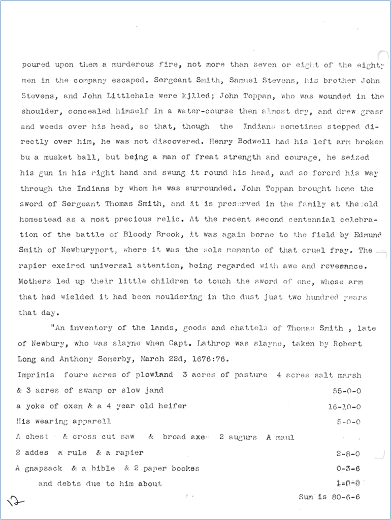 The attack was devastating. Nearly 90 colonial soldiers and teamsters were killed in what became known as the Bloody Brook Massacre. Most of the dead were young, unmarried men from Essex County. Captain Lothrop was among those killed early in the battle.